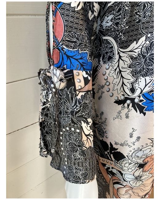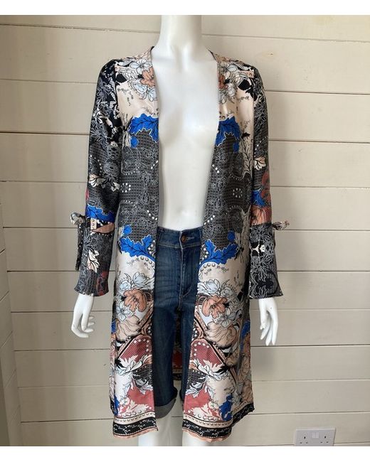 A lovely long satin duster jacket in a bold multicoloured floral print by River Island. It’s an unlined polyester with fluted sleeves that are split halfway up and have a tie detail, it’s open fronted, no fastenings and there are long split sides.