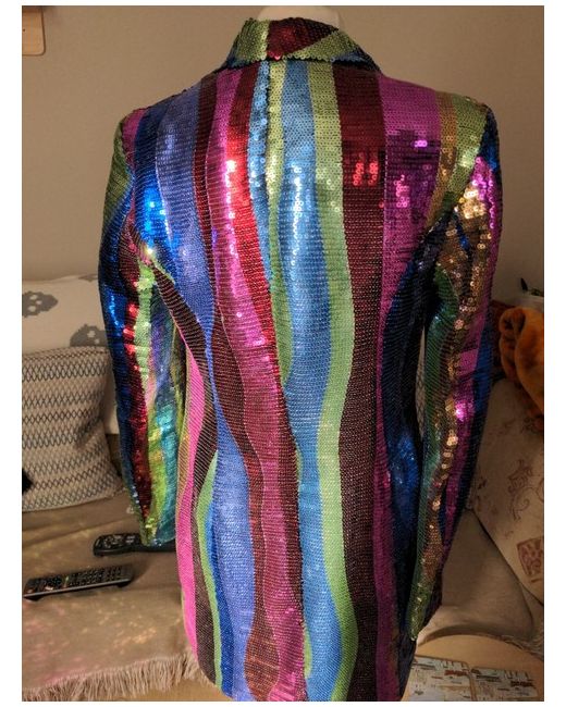 The jacket features a vibrant rainbow sequin fabric, with a V-neckline and snap closure. The long sleeves make it suitable for any occasion, and the hip length adds an extra touch of sophistication.