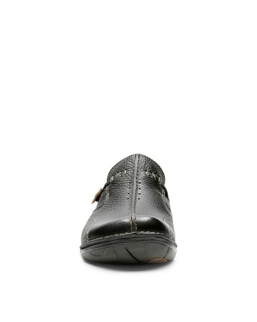 Clarks Un Loop Leather E Fit Slip On Shoes. Underfoot cushioning and breathable leather linings keep feet fresh and comfortable. The black leather upper is hardwearing and durable.