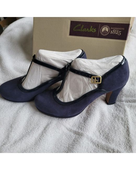 Clarks Chorus Tempo, Navy Suede. These Clarks shoes are a UK size 5.5 with an E fitting. They are made of blue suede and feature a court style heel. Perfect for a touch of sophistication in your wardrobe. Only worn once in the house. From smoke free home. RRP £50.00.