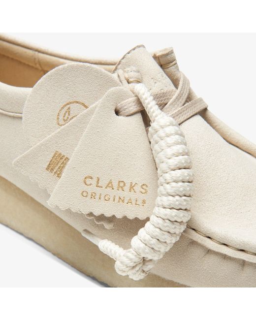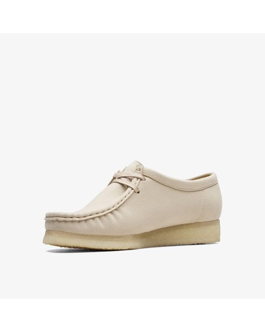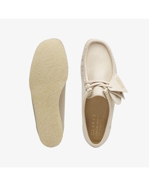 Expanding the family our vegan Wallabee arrives in off-white for easy autumn/winter wear. Crafted from a unique Italian microfiber that feels like suede our iconic style delivers durability flexibility and comfort – without the leather. Vegan-friendly off-white microfibre upper Features bespoke vegan-friendly heel fob and upper stamps Natural rubber crepe sole Finished with embossed Clarks Originals fobs Made in Portugal
