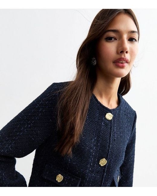 Colour: navy. Length: crop. Fit regular. this bouclé jacket is the perfect styling tool. For maximum impact, pair with the co-ordinating mini skirt or keep it casual with a pair of jeans. Fastening: button front.