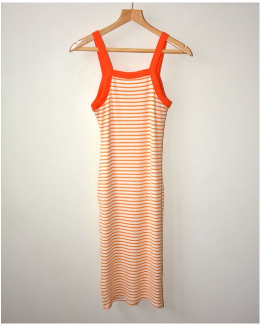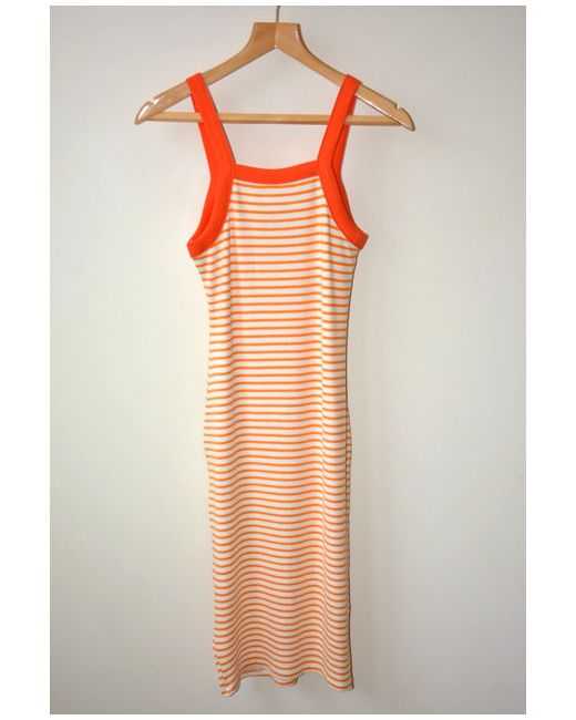 Cream With Orange Horizontal Stripes. Orange Contrast Trim Square Neckline (Front And Back). Affordable Fashion Just For You. Bodycon Fit.