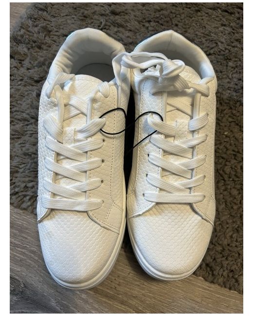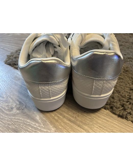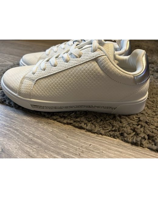 Choose these diamanté trim trainers for days when you want to add a bit of extra sparkle. The contrast heel tab and snakeskin-effect texture provide added interest. Made with our Comfort* features. This piece is registered by The Vegan Society and is completely animal free. Material: faux leather Fit: standard Shoe Style: trainers Colour: white/silver Fastening: lace-up fastening Toe: round toe Design: diamanté trim, snakeskin texture Heel Height: flat