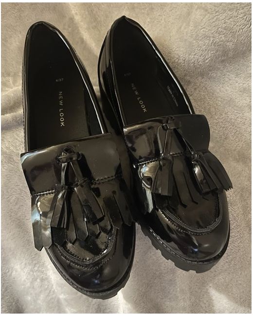 Chunky loafers by New Look in black patent leather, size 4 (UK), featuring a standard shoe width and a faux leather insole. These women's loafers are perfect for work, school or casually.