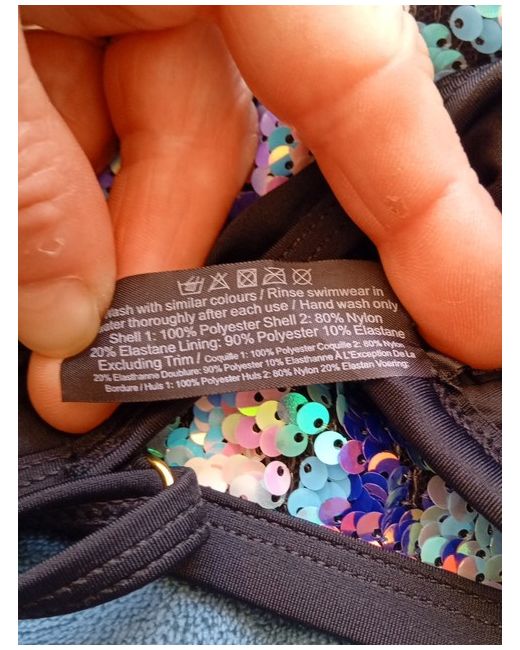 new look size 10 removable pads hygiene sticker in briefs black and multi coloured sequins on front of the top and briefs adjustable shoulder straps from a pet and smoke free home