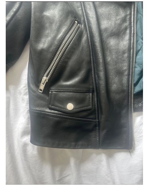 Crafted by H&M, this women's real leather jacket in size 8 offers a sleek blend of style and functionality. The biker-inspired design features a resilient outer shell of black leather, paired with a comfortable polyester lining for day-long wear. Its mid-length cut and regular fit make it a versatile addition to any wardrobe, suitable for an array of occasions.The jacket includes practical elements such as a lined green quilted interior for added warmth, handy pockets for personal items, and a zip fastening to ensure a secure fit.