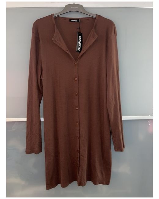 BNWT Boohoo Rib Button Through Long Sleeve Mini Dress Chocolate Brown Size 16.