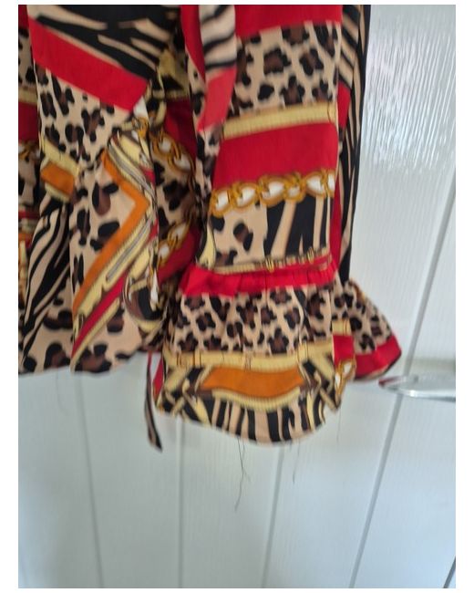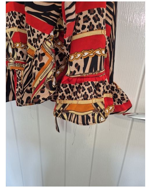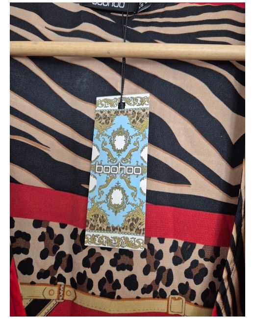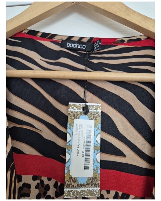 Boohoo wrap dress, brand new. Size 16. Red with Tiger and Leopard Print details and ruffled sleeves and bottom.