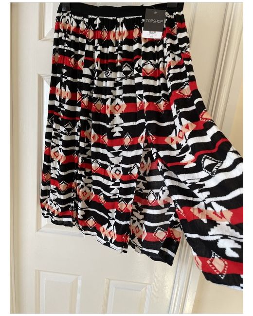 Ticket price £38 Waistband laid flat 16” Length 29” Elevate your wardrobe with this stunning Topshop skirt in a striking Aztec print. The black, red, and white colour scheme is eye-catching and perfect for any occasion. Made from a crinkle cotton fabric, this skirt features slits to the front and side for added movement and style. The gathered waistline, zip closure, and below-knee length make this skirt both comfortable and flattering. Perfect for any fashion-forward woman, this NWT Topshop skirt is sure to turn heads.
