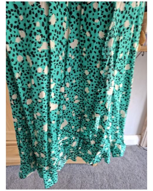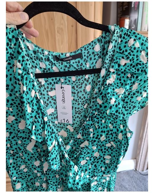 The George Women's Dress in size 12 is a stylish and versatile option for the summer season. Made from a combination of polyester and viscose, this knee-length dress features a flattering fit and flare style with a V-neckline and short cap sleeves. The animal print pattern in jade green adds a trendy touch, perfect for casual occasions. Easy to care for with its machine washable design, this dress from George is a must-have addition to any woman's wardrobe.