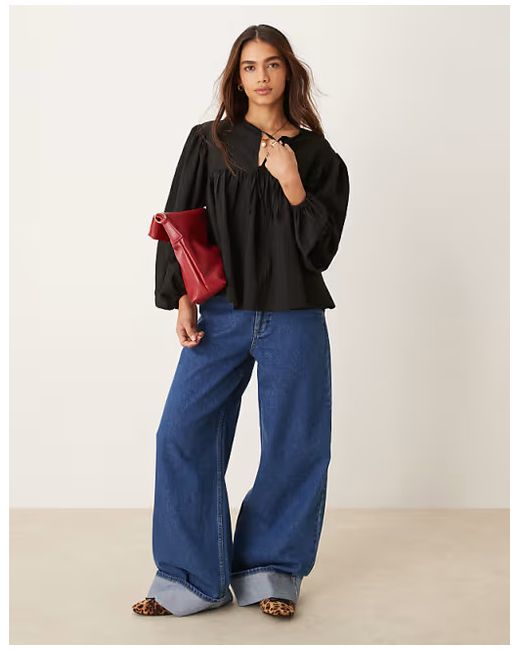ASOS DESIGN jacquard smock top with tie neck detail in black. Regular fit. Size 10 UK.