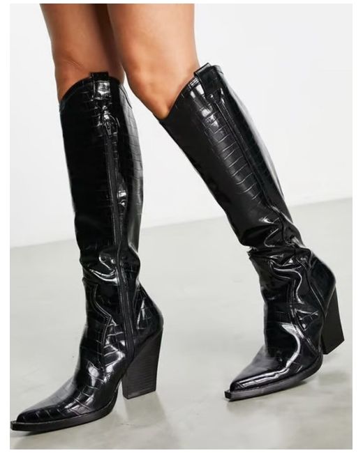 ASOS DESIGN Catapult heeled western knee boots in black croc