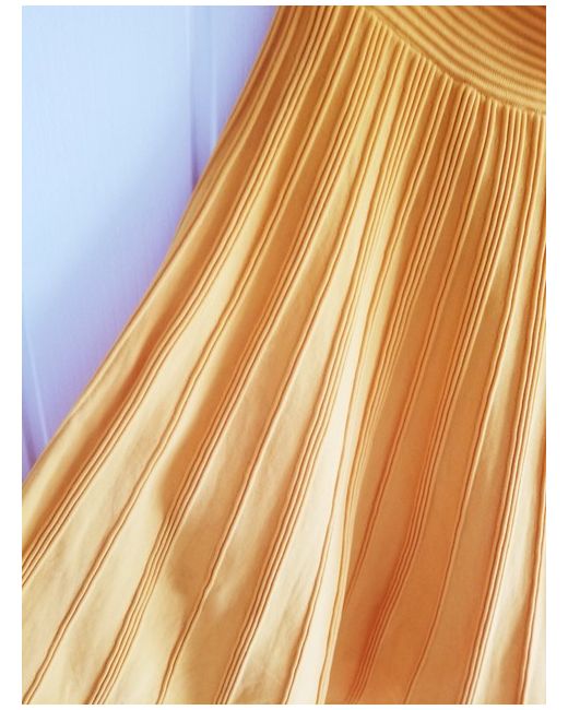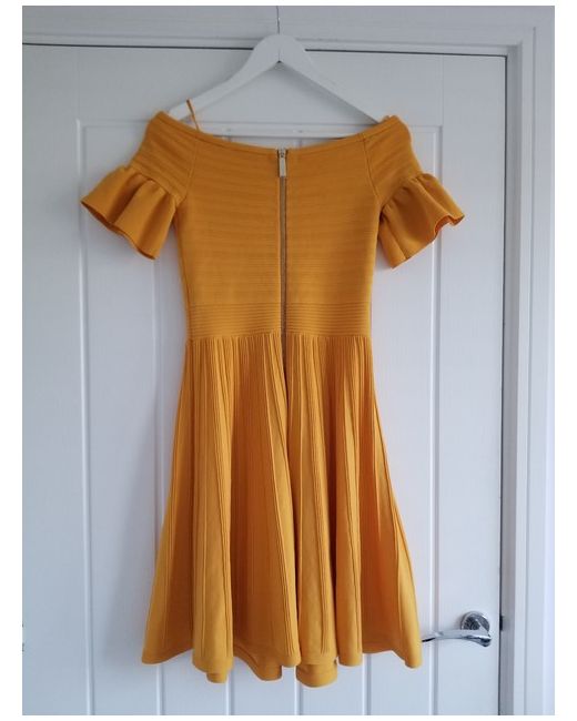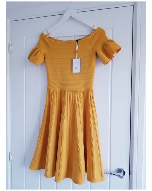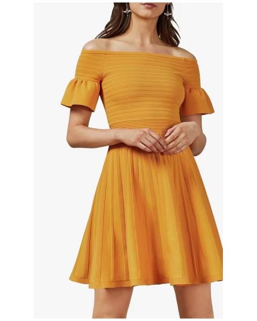 Ted Baker Criptum Bardot Frill Knitted Skater Dress. Stretchy, knitted fabric. Colour Yellow.