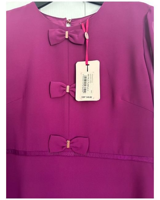 Beautiful women’s brand new Ted baker fit and flare style dress, in a light purple with chiffon three quarter sleeves. Tags included and covers on buttons. Bows to front of the dress with branding on.
