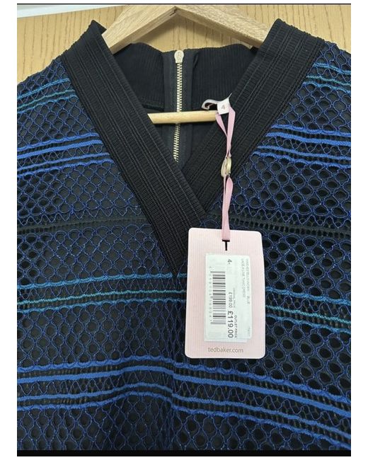 Elevate your wardrobe with this stunning Ted Baker net dress in a beautiful shade of blue. Perfect for any casual occasion, this knee-length dress features a flattering A-line silhouette, short sleeves, and a V-neckline. The dress is made of a blend of polyester, viscose, and cotton, making it comfortable to wear all day long. The dress is lined and has a zip closure at the back. It's perfect for the spring and summer seasons. The dress is available in size 14 and is suitable for regular-sized women. Add this dress to your collection and make a statement wherever you go.