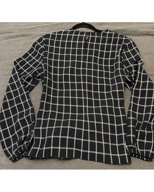 Ted Baker in size 2, (UK10) navy & white check with lovely blouson long sleeves. The material is a blend of polyester and viscose, making it a regular fit top.