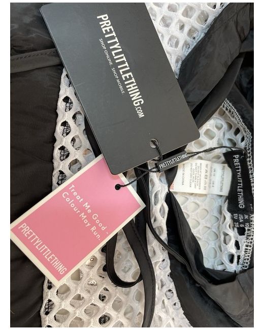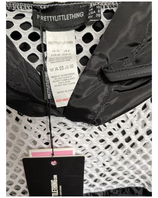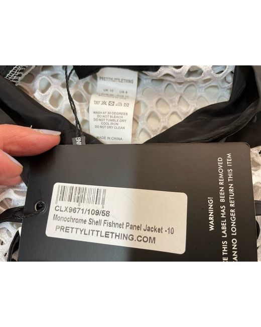 On offer is a Pretty Little Thing (PLT) size 10 monochrome shell fishnet panel jacket with hood UK size 10, chest measures 40”, length is 15” and arm length is 18” Brand new with tags