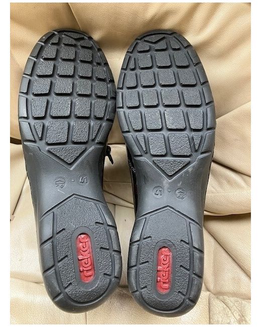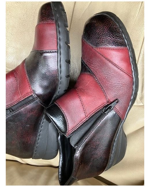 Smart boot style shoe perfect with trousers. Dark red with shiny black trim. As you can see from photo of soles these have never been worn. Bought online at end of season but then had problems with my ankles puffing up so was never able to wear them.