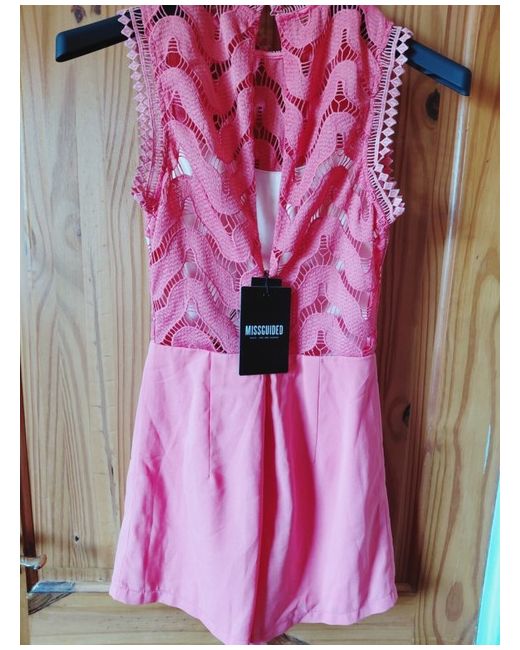 Embrace the effortless charm of this salmon pink playsuit from Misguided, a piece that blends modern style with a touch of vintage flair. The one-piece is thoughtfully designed for a regular fit, ensuring comfort without compromising on elegance. Size 8, it's a versatile addition to any wardrobe, perfect for a variety of occasions.The playsuit features an exquisite mix of lace and crochet fabric, lending a sophisticated yet playful texture that's sure to turn heads. Its all-in-one style makes it a fashionable alternative for both daytime outings and evening events, allowing you to make a statement with minimal effort.