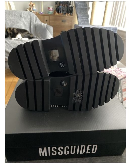 These stylish combat boots from Missguided are a must-have for any fashion-forward woman. With a sleek black faux leather upper, these boots are perfect for any outfit and occasion. The UK shoe size 5 fits comfortably, making them ideal for all-day wear. The boots are designed with a sturdy sole and a comfortable footbed, ensuring that they will provide support and protection throughout the day. Whether you're heading to work or going out with friends, these boots are sure to make a statement. Add them to your wardrobe today and step up your style game!