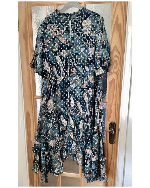 This Monsoon dress in size 22 features a floral pattern with flutter sleeves and ruffle accents. It has a hi-low hemline and a fit & flare style, making it suitable for party or cocktail occasions. The dress is multicoloured and has a button closure, adding a touch of elegance to the outfit.
