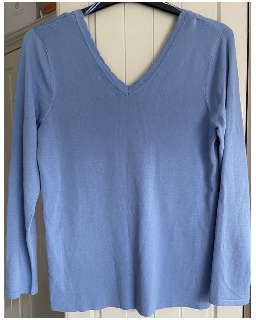 The Monsoon light blue V neck jumper in size Large, also has a V at the back unworn Viscose and polyester