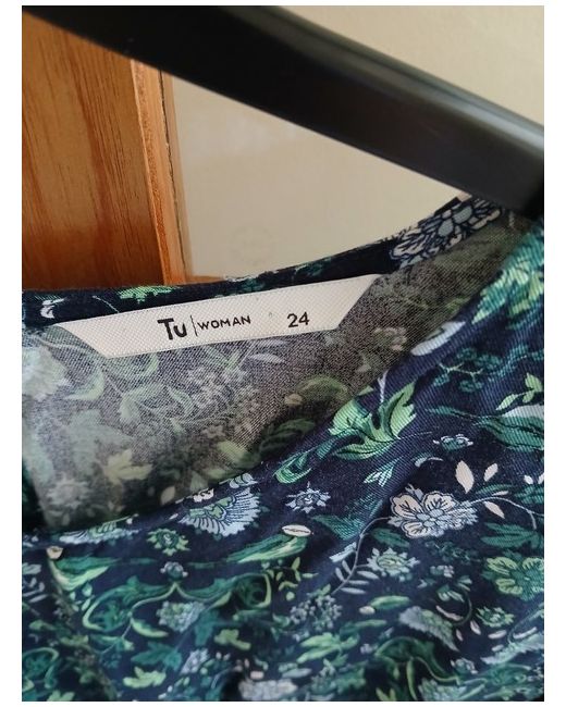 Tu Long Sleeve Blouse /Top Size 24 ,Long Sleeves With Gathers In Sleevehead And Elatic At Cuff ,Shirring At Waist ,Keyhole Fastening With Button At Back ,Navy With Green,White And Blue Floral Design.