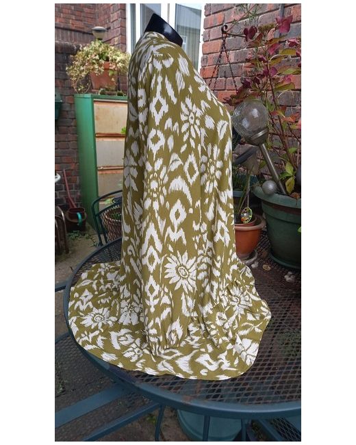 Green and white patterned over the head v neck dress. with elastic to the ends of the long sleeves and 7.5" ruffle at hem. Centre front 32.5" back 34.5" bust 48" and waist 50".