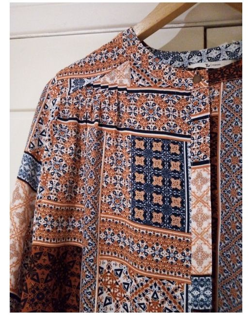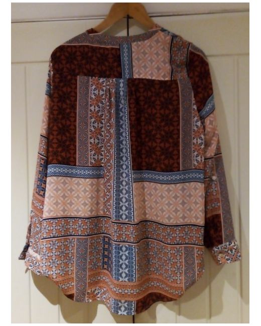 To fit bust: 23in (46in from underarm to underarm). Add a touch of vibrancy to your wardrobe with this stunning multicoloured patchwork blouse from Tu Woman. This collarless blouse features long roll tab sleeves and a lightweight chiffon fabric, making it perfect for all seasons.
