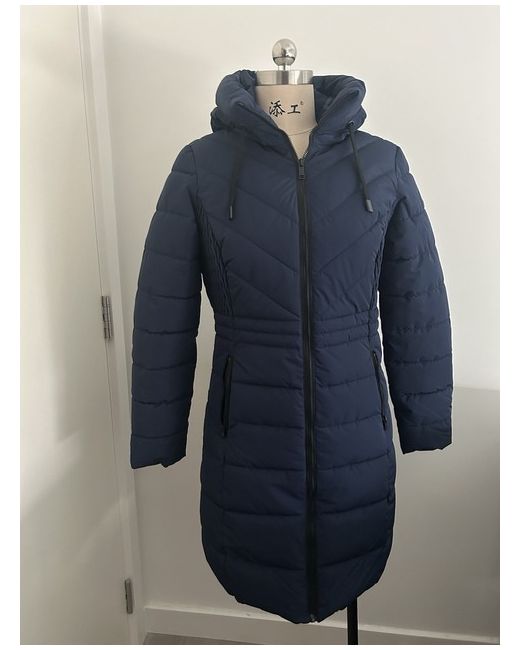 Navy padded style hooded coat with zip on furry trim and knitted cuffs. 10.