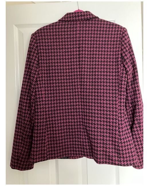 Lovely black and dark pink pattern jacket. The jacket has got front pockets and front black buttons for fastening. The shoulders are padded. The jacket is fully lined with a black lining. Length from top of the shoulder to the bottom is approx 25.5 inches long. Never worn and in excellent condition. From a smoke and pet free home. Unfortunately no returns accepted.