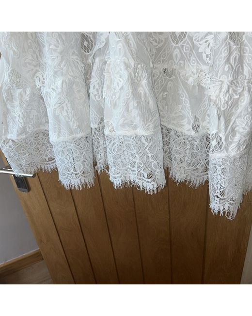 Lots of detail, lace and overlay. never worn just got to many clothes and this is too stunning to leave on my wardrobe one size i’m a 22 and fits fine but would equally look good on a smaller size and could wear as a cover up ?.