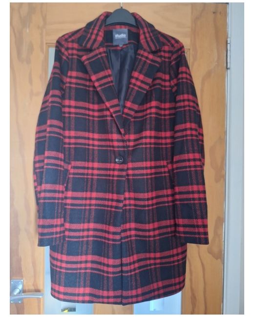 This Studio Coat in a red and black check pattern is a stylish mid-length pea coat, perfect for a casual and relaxed fit in size 10. Made from polyester, it features long sleeves and a button closure. The coat is ideal for the autumn and spring seasons, adding a rock, grunge, or retro theme to your outfit. The brand Studio ensures quality and style in this fashionable outerwear piece for women.