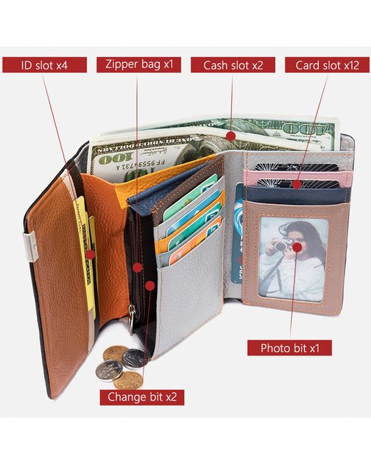 This multi-functional genuine leather wallet features 12 card slots, 4 ID slots, 2 cash slots, 1 zip pocket, and 1 photo slot. The unique patchwork design makes each wallet distinct. Measuring 14cm x 9cm x 2.5cm, it's perfect for everyday use. Made from high-quality leather, it is soft and durable.