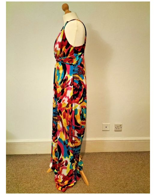 This is a maxi length dress with abstract pattern details. The style is wrap bodice with A-line flow. This is a pull over dress with stretch. I try to take photos in the best lighting but the colours from the photos may vary from the actual item.