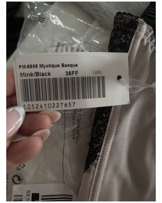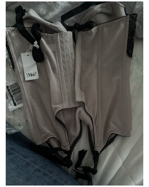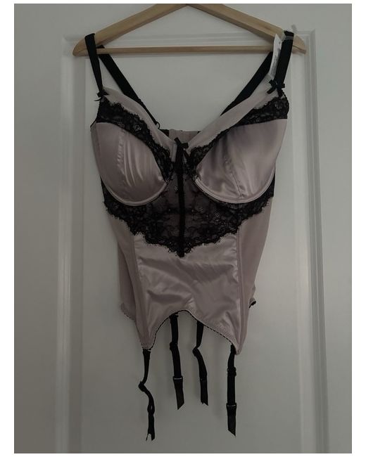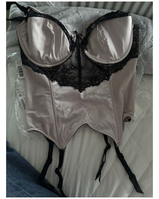 Does not come with matching knickers. Suspender belt attachments which can be removed Pale mink/pink with black lace Flattering and sexy