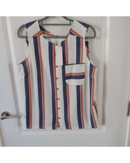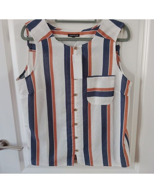 Warehouse Ladies Sleeveless Striped Top. Brand New With Tags. Front button and loop fastening and front pocket. Back yoke. Size 14. Length from shoulder approx 24 inches. Measurement from underarm to underarm approx 20 inches. 71% viscose, 29% polyester. Machine washable. Smoke and pet free home. Please ask any questions. Please see my other items for sale as happy to combine postage. Thank you for looking.
