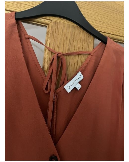 This Warehouse cropped blouse in size 14 is a stylish and versatile addition to any woman's wardrobe. In a flattering rusted brown colour, the blouse features short sleeves and a regular fit, making it perfect for casual occasions in the summer season. Made from easy-to-care-for polyester, this blouse is machine washable for convenience. With its trendy design and quality construction, this blouse from Warehouse is sure to become a favourite piece in your collection.
