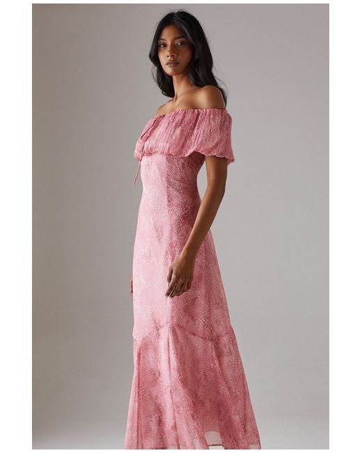 WAREHOUSE Chiffon Bardot Godet Insert Milkmaid Midi Dress.