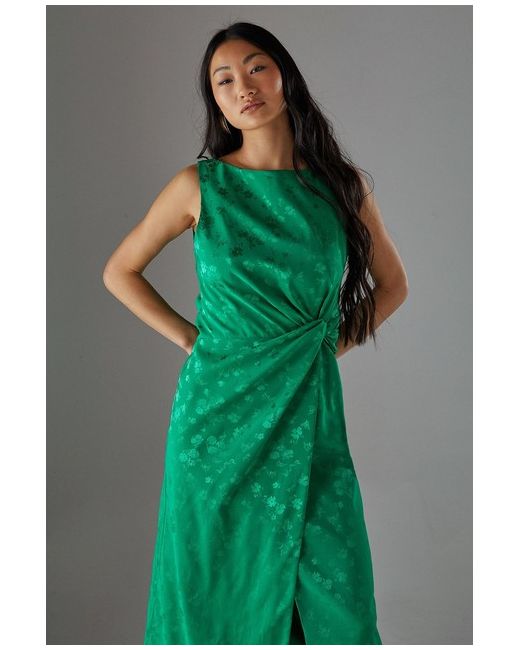 The feather trim hemline introduces a touch of playfulness to this otherwise sophisticated piece. For evening soires, add a sleek clutch and delicate bracelet to complete your ensemble. WAREHOUSE Petite Satin Jacquard Feather Twist Front Cowl Back Midi Dress.