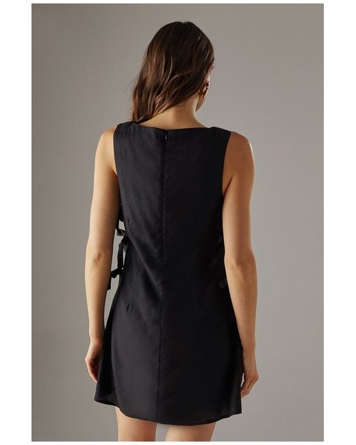 The sleeveless design with a high neckline creates a refined canvas that allows the side detailing to truly stand out. WAREHOUSE Premium Linen Blend Bow Side Mini Dress.
