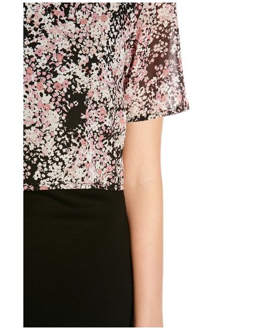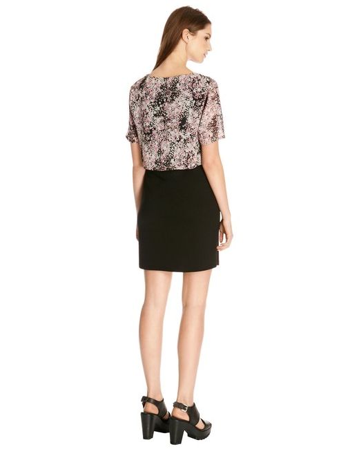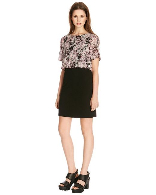 This lightweight woven dress features a sheer printed overlay top and contrast skirt.