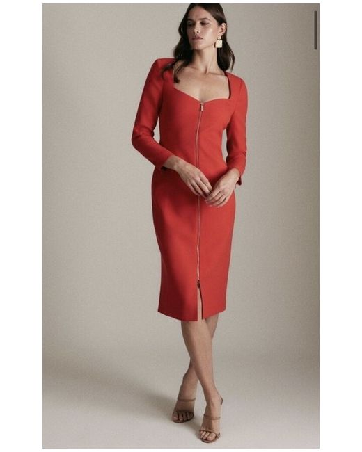 Karen Millen Structured Crepe Zip Front Pencil Dress. RRP £199. Details & Care Main: 34% Viscose, 32% Polyester, 30% Recycled Polyester,4% Elastane. Lining:100% Polyester. Dry Clean only. Model wears size UK 8/ US 4. Model Height :5'9. UK size 10 centre back length:110cm