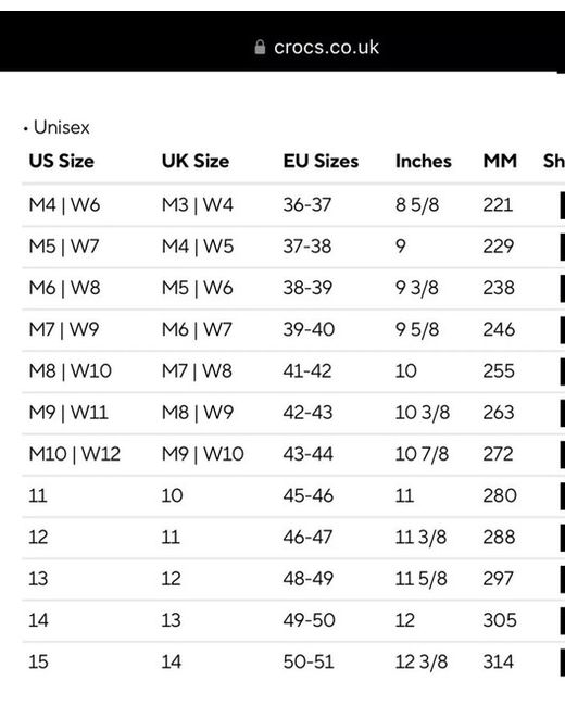 Unisex Crocs, Uk size womans 6, Mens 5,, Crocs show U.S sizes,,,only opened to try on, found my second toes poked thru the holes as they are longer than my big toes making them a bit uncomfortable for me to wear 😢, Paid £55 for them from Next, but am now unable to return as I have removed all the labels.