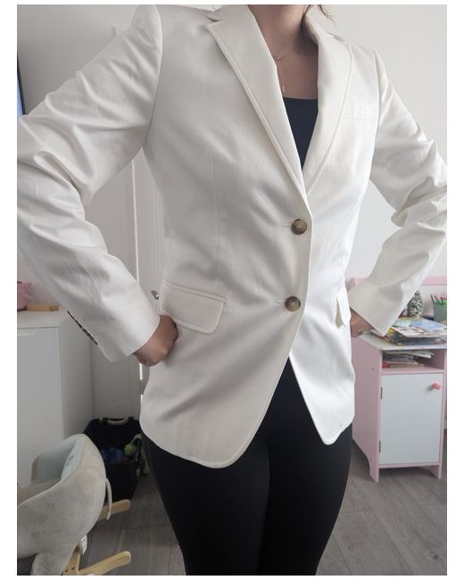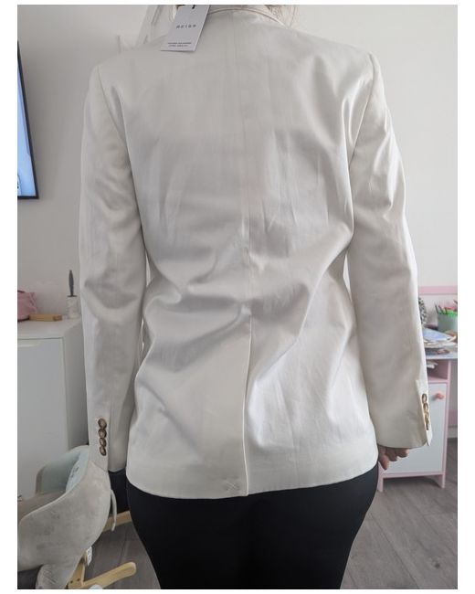 Crafted with precision, the Reiss Women's Blazer in size 6 is a versatile addition to your wardrobe. It seamlessly transitions from a day at the office to a casual evening out with its clean white colour and understated designer theme. The blazer features a cotton outer shell for comfort and breathability, tailored to fit a regular size type with a standard two-button closure. Attention to detail is evident in the garment's accents, including the sophisticated button trim, ensuring it stands out in a sartorially pleasing way. Ideal for the transitional seasons of autumn and spring, this piece is dry clean only to maintain its impeccable look. Whether for business or casual occasions, this blazer is an embodiment of modern style and functionality.