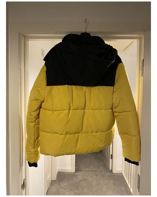 This is a new F&F yellow and black padded coat in size 16 for women. The coat is made of polyester and features a puffer jacket style. It is suitable for casual occasions and comes in a vibrant yellow colour.