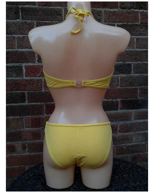 F&F bright yellow bikini size 12, bandeau style with halterneck. This is a slightly brighter yellow than appears in the photographs.