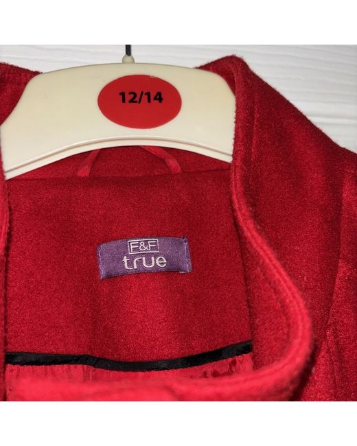 This red F&F lady coat in size 22 is made of polyester fleece with a button closure and a collared, mid-length style. Suitable for parties, casual, or formal occasions, this winter/spring coat features long sleeves and accent buttons. It has a regular fit and is machine washable. Perfect for outdoor wear, this coat has a polyester lining and insulation.