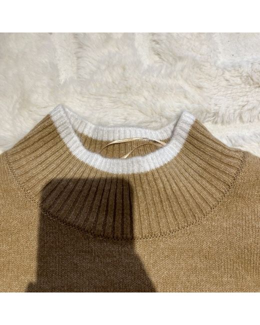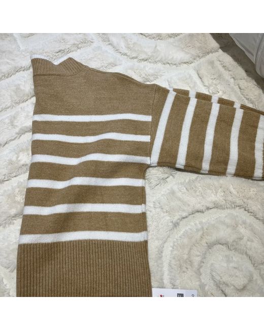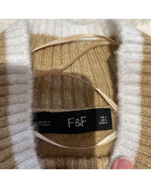 Tesco (F&F) L brown (camel) and white striped jumper with a high neck and wide sleeves. Bought and then forgot to return, so new with tags. Says size L but bought as a slightly baggy size 12.